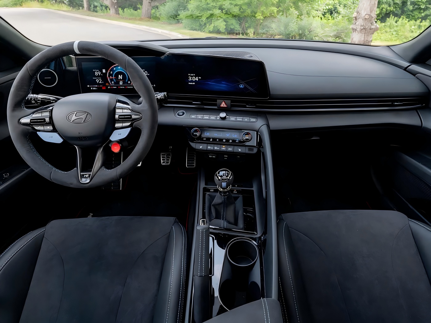 În ceea ce privește interiorul, aspectul general al noii mașini nu este mult diferit de cel al Elantra N, dar este echipat cu un volan „N performanță” Alcantara cu un marcaj de poziție de ora 12. Între timp, rândul din față este echipat cu centuri de siguranță albastre, pervazul ușii sunt prevăzute cu n gardieni de prag de metal performanți, iar mașina are, de asemenea, n covorașe de performanță, precum și un număr mare de kituri interioare Alcantara. De exemplu, maneta de frână de parcare manuală, maneta de schimb de viteze și cotiera cu cutie de cotieră sunt înfășurate în Alcantara. În cele din urmă, există un logo „Versiunea TCR” pe luminile mânerului ușii, care este plin de apel emoțional.